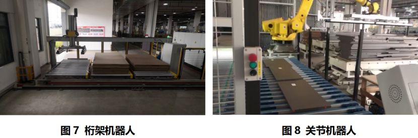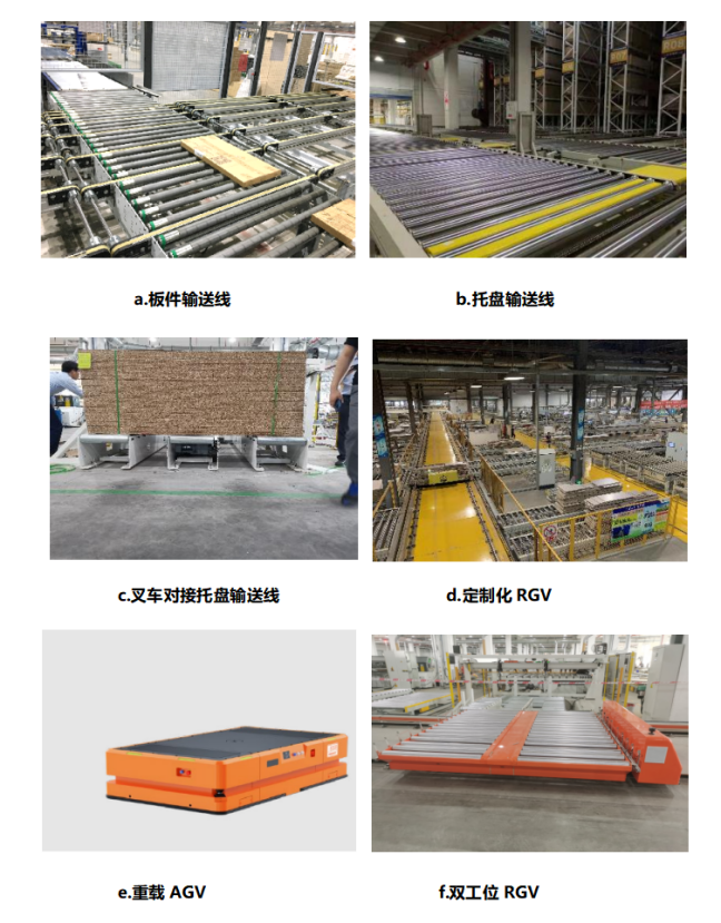 输送设备包含轻载、单片流输送的板件输送线,重载、托盘级别的托盘输送线,与叉车对接的三排滚筒输送线,车间多段工序间接驳搬运的定制化RGV,双/四工位RGV等,以满足家居行业多种规格垛型的搬运需求。适合定制家居行业、板材行业场景需求的板材生产订单拣选设备。(1)关节机器人:分拣效率为200~240件/时;一对一,一对二。(2)龙门机器人:分拣效率为150~180件/时;一对多,多对多。(3)推板机构+升降输送机:分拣效率为80~110件/时;一对一。适合定制家居行业场景需求的板式家具成品订单的小板件拆码垛,通常大板材经过电子锯裁切后形成小板件,整垛的小板件送到后段的封边工序,需要拆成单片流。