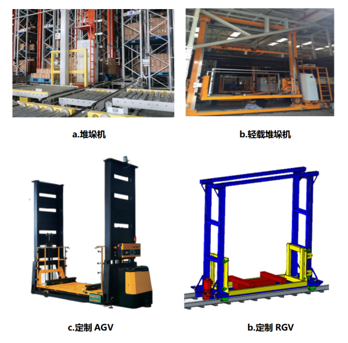 针对家居行业大部分是大件物流的存储需求,在存储场景使用以下四大类设备。(1)堆垛机:适合新建立体库,高物动量、高存储率,地面载荷一般在6000千克/平方米以上。(2)轻载堆垛机:适合单层平库改造,高物动量、中等存储率,地面载荷一般在1500~2500千克/平方米。(3)定制AGV:适合多层楼库改造,中等物动量(柔性化),地面载荷一般在900~1500千克/平方米。(4)定制RGV:适合多层楼库改造,中等物动量,地面载荷一般在600~900千克/平方米。