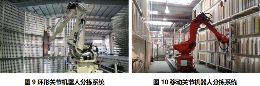 适合定制家居行业场景需求的板式家具成品订单的板件分拣和缓存,通常大板材经过电子锯裁切后形成小板件,小板件再依次经过封边、打孔、检验等专机生产设备后形成成品板件,多个成品板件需要通过分拣、缓存进行齐套,之后才能包装。(1)环形关节机器人分拣系统:分拣效率为700件/时。(2)移动关节机器人分拣系统:分拣效率为100~150件/时。